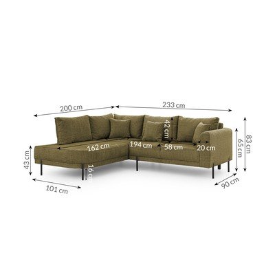 Zsenília, bal oldali-L alakú, zöld, háziállatbarát-foltálló, négyszemélyes, szélesség 233 cm